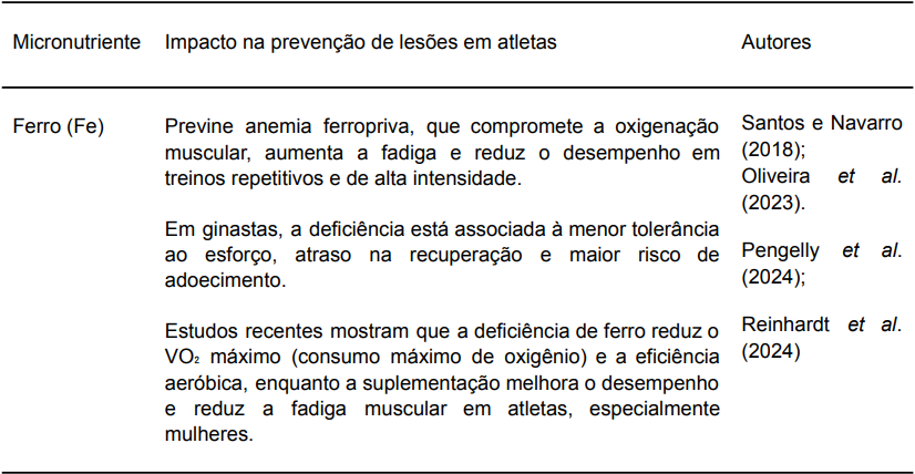 A partir da análise da literatura, percebe-se que o ferro, o cálcio e a vitamina D exercem funções complementares e indispensáveis na prevenção de lesões em ginastas. Conforme apontam Santos e Navarro (2018), o ferro se destaca pela sua relação com o transporte de oxigênio e com a tolerância ao esforço, e sua deficiência pode levar à fadiga precoce, maior suscetibilidade a adoecimentos e, consequentemente, menor rendimento nos treinos e competições. Nesse sentido, os achados de Reinhardt et al. (2024) reforçam as observações de Santos e Navarro (2018), ao evidenciarem que a deficiência de ferro reduz o consumo máximo de oxigênio (VO₂máx) e a eficiência aeróbica, enquanto sua adequada suplementação melhora o desempenho e reduz a fadiga muscular em atletas.
