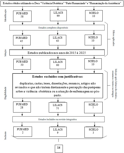 Para garantir a qualidade da pesquisa, está busca foi guiada pela Preferred Reporting Items for Systematic Reviews and Meta-Analyses (PRISMA), seguindo quatro etapas fundamentais descritas no fluxograma: identificação, seleção, elegibilidade e inclusão. Inicialmente foram identificados 167 registros, sendo 58 na PubMed, 99 na LILACS e 10 na SciElo. Após a filtragem aplicada, permaneceram no estudo: 118 registros, sendo, 45 na PubMed, 63 na LILACS e 10 na SciElo. Em seguida, foi feita a leitura de títulos e resumos, considerando os critérios de elegibilidade, que resultaram em 100 estudos publicados entre os anos de 2015 à 2025, sendo 30 na PubMed, 60 na LILACS e 10 na SciElo. Posteriormente, 86 artigos foram excluídos após a leitura completa, por não atenderem os critérios de inclusão definidos, sendo, 28 na PubMed, 51 na LILACS e 7 na SciElo. Dessa forma, 14 artigos permaneceram na amostra final, sendo 2 na PubMed, 9 na LILACS e 3 na SciElo, os quais compuseram a revisão integrativa.