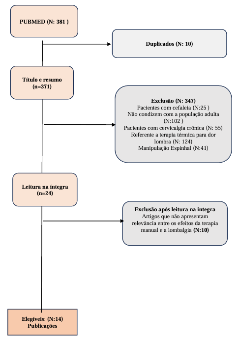 O processo de exclusão deu-se mediante a leitura de títulos, constatou-se 10 publicações duplicados, 25 de pacientes com cefaleia, 102 que não condizem com a população adulta, 55 pacientes com cervicalgia crônica, 124 referente a terapia térmica para dor lombar, 41 manipulação espinhal e 10 leitura na integra. Totalizando 367 publicações excluídas. Ficando elegíveis 14 publicações. Assim, para a melhor visualização dos resultados da seleção de periódicos na base de dados, foi construído, o fluxograma (Figura 1).
