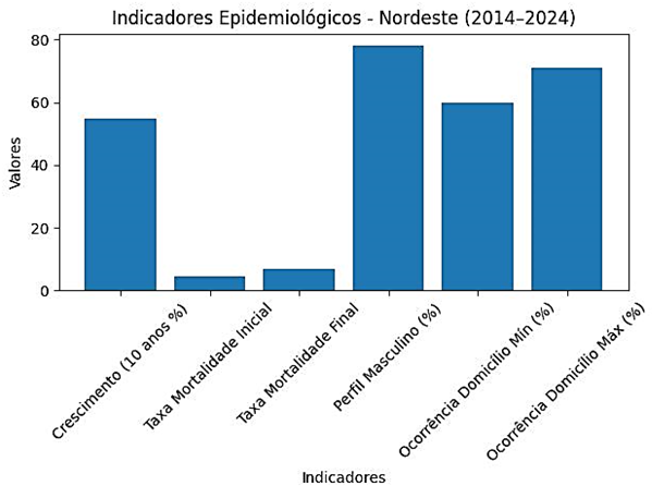 A análise dos dados epidemiológicos provenientes do DATASUS e do Ministério da Saúde evidenciou crescimento expressivo da mortalidade por suicídio na região do Nordeste entre os anos de 2014 e 2024. Observou-se aumento aproximado de 54,9% no número de casos ao longo do período analisado, configurando a região como uma das que apresentou maior crescimento proporcional no país.