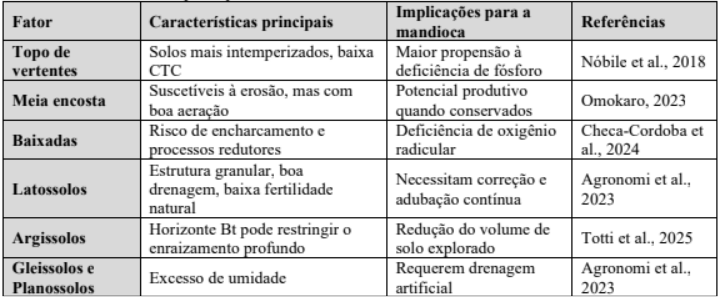 Ainda assim, os dados compilados fornecem subsídios importantes para a  otimização da produção de mandioca, ressaltando que estratégias de manejo que  considerem simultaneamente a fertilidade química, a morfopedologia e o contexto  geomorfológico são fundamentais para maximizar produtividade e sustentabilidade  agrícola.