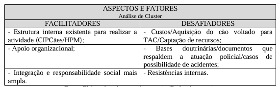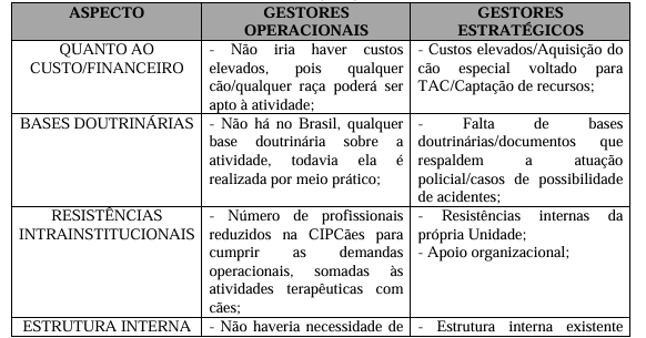 Ao passo que como contraponto, apontam os seguintes aspectos como obstáculo para realização da implantação: a) Custos/Aquisição do cão voltado para TAC/Captação de recursos; b) Inexistência de bases doutrinárias/documentos que respaldem a atuação policial/casos de possibilidade de acidentes; e, principalmente; c) Resistências internas.