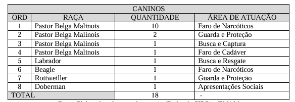 Com esta base, os aspectos metodológicos foram fixados na própria Instituição, por meio de entrevistas e questionários aos gestores da Companhia Independente de Policiamento com Cães, do Comando de Policiamento Especializado, da Diretoria de Saúde, da Diretoria de Promoção Social, das Diretorias Logísticas, Financeiras, e PM6/Seção de Projetos.