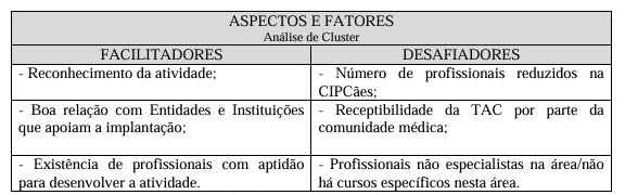 Ao passo que apontam para perspectivas desafiantes: a) Número de profissionais reduzidos na CIPCães; e) Receio da pouca receptibilidade da TAC por parte da comunidade médica; f) Profissionais não especialistas na área/não há cursos específicos nesta área.