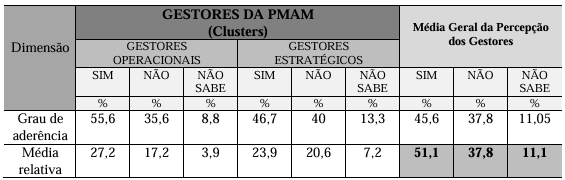 Em termos de percentual a Tabela 1 ratifica os dados captados, já apresentados graficamente, para melhor entendimento estatístico, dentro do universo de amostras coletadas entre os gestores.