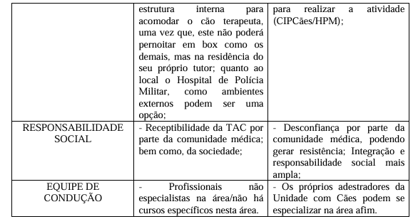 Ao observarmos as perspectivas dos principais gestores da Unidade Especializada com Cães com relação à implantação do Núcleo de Atividades Terapêuticas Assistidas por Cães, notadamente vê-se a preocupação com o número de profissionais reduzidos para as diversas atividades realizadas pela Unidade militar, que permeariam além de suas atribuições usuais no combate à criminalidade, e as diversas operações, acrescidas da atividade terapêutica em si; bem como veem como desafio a quebra de paradigma entre a função policial e a receptibilidade da comunidade médica com essa atividade não convencional em ambiente hospitalar.
