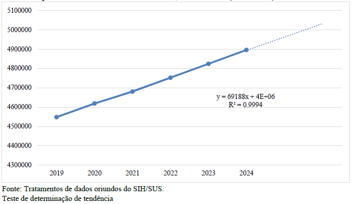 No que se refere à análise regional, observa-se que o valor total gasto com internações na região Nordeste, entre os anos de 2019 e 2024, foi de aproximadamente R$ 42,7 milhões. Somente no ano de 2024, o número de internações na região alcançou cerca de 93 mil casos, sendo que o estado do Maranhão respondeu por aproximadamente 32 mil dessas internações, o que corresponde a cerca de 34% do total. Com base nessa proporção, estima-se que o gasto proporcional do Maranhão seria em torno de R$ 14,5 milhões.