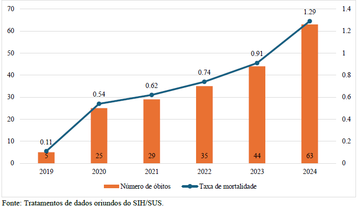 No período de 2019 a 2024, observou-se um aumento progressivo tanto no número de internações quanto de óbitos. Em 2019, foram registrados os menores índices do intervalo analisado, com 447 internações e 5 óbitos. Em contrapartida, em 2024, os números chegaram a 15.227 internações e 63 óbitos, evidenciando um crescimento expressivo ao longo dos seis anos, conforme mostra o gráfico 3.