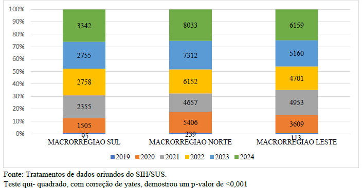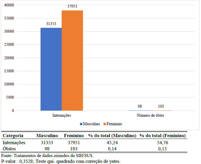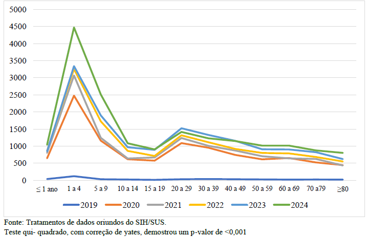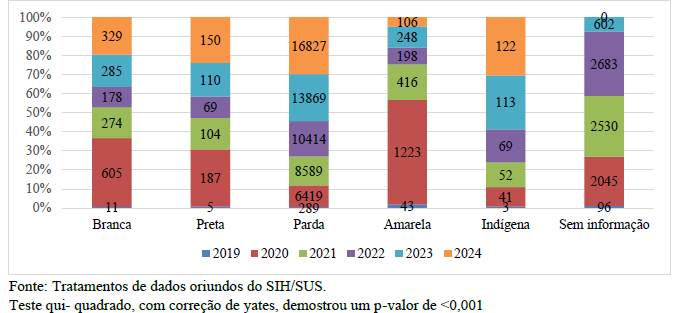 Ressalta-se que os registros referentes ao ano de 2019 foram mantidos na análise considerando a dinâmica administrativa das Autorizações de Internação Hospitalar (AIH), uma vez que parte das internações iniciadas no final de 2019 pode ter sido lançada ou consolidada no sistema apenas em 2020, configurando uma zona de interseção entre os períodos. Dessa forma, os dados do ano inicial da série temporal devem ser interpretados com cautela nas análises comparativas. As análises estatísticas inferenciais foram conduzidas de maneira exploratória, com aplicação do teste do qui-quadrado com correção de Yates exclusivamente nos cenários em que seus pressupostos estatísticos foram atendidos. Quando necessário, as frequências esperadas foram estimadas a partir de dados demográficos oficiais do Instituto Brasileiro de Geografia e Estatística (IBGE).