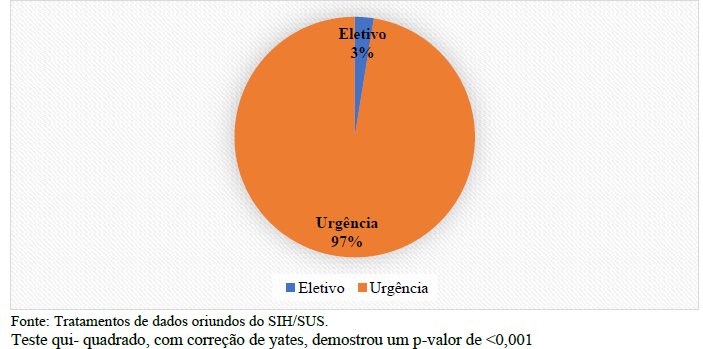 No que diz respeito ao caráter de atendimento foi possível identificar que a maioria deles foi na urgência. A elevada demanda por atendimentos de urgência é uma realidade observada em diversos municípios brasileiros, conforme mostra o gráfico 2. De forma semelhante um estudo realizado na macrorregião leste do Estado do Paraná entre os anos de 2013 a 2023, mostrou a importância da atenção primária à saúde ao caráter de atendimento, as hospitalizações de urgência foram prioritariamente evidenciadas no recorte temporal, com 600 casos (96%) (Millnitz et al., 2024).