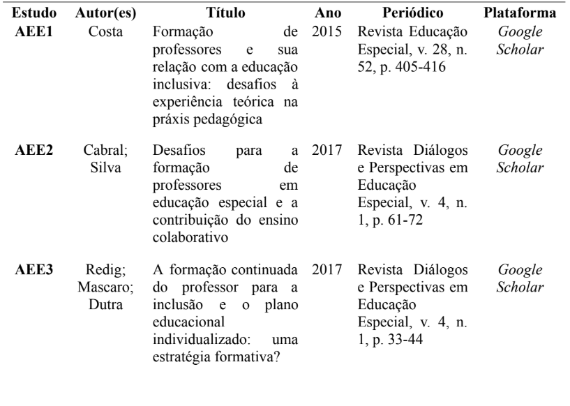 A predominância de estudos publicados em 2017 indica um período de ampliação das discussões acadêmicas sobre a formação docente para a inclusão. No entanto, a lacuna de artigos mais recentes sugere a necessidade de novas investigações que avaliem o impacto das políticas educacionais implementadas nos últimos anos, bem como sua eficácia na capacitação de professores para práticas inclusivas. Os artigos analisados foram extraídos de bases indexadas e publicados em periódicos de relevância na área, sendo dois deles na Revista Diálogos e Perspectivas em Educação Especial e um na Revista Educação Especial (Tabela 1).