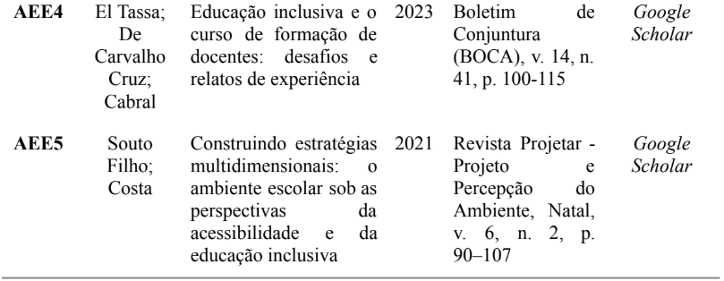 A análise bibliográfica contemplou três estudos selecionados a partir da base de dados Google Scholar considerando publicações que abordam a formação docente no contexto da educação inclusiva, para base da SciELO não foram encontrados resultados mediante aos descritores aplicados. Os artigos revisados foram publicados entre 2015 e 2023, demonstrando que, embora publicados nos últimos dez anos, os debates sobre os desafios da formação de professores para a inclusão permanecem relevantes e em constante evolução.