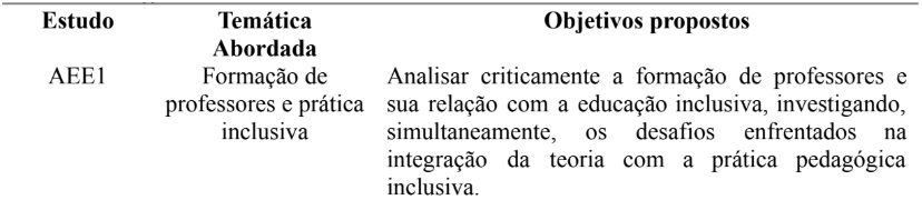 A análise dos estudos selecionados permitiu identificar diferentes abordagens sobre a formação docente para a educação inclusiva e seus objetos de estudo, abrangendo desde os desafios estruturais da formação inicial até a necessidade de contínua qualificação profissional para o atendimento educacional especializado (AEE) (Tabela 2). O primeiro estudo (AEE1), de Costa (2015), investiga a relação entre a formação docente e a prática da educação inclusiva, evidenciando os desafios na articulação entre teoria e prática pedagógica.