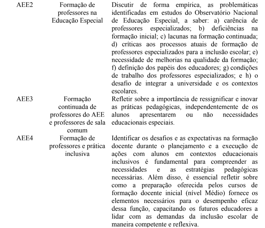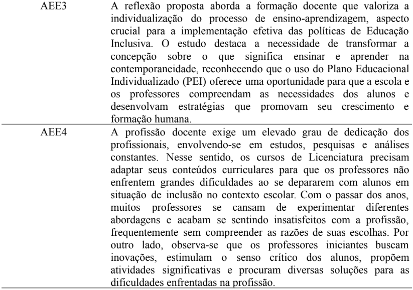 Os estudos AEE1 (Costa, 2015) e AEE4 (El Tassa et al., 2023) abordam a formação docente e sua relação com a prática inclusiva, enfatizando a dificuldade de alinhar teoria e prática pedagógica. Ambos destacam que a preparação inicial dos professores ainda é insuficiente para lidar com a diversidade educacional, tornando essencial o aperfeiçoamento das estratégias formativas. No estudo AEE2 (Cabral; Silva, 2017), a formação de professores na educação especial é analisada de forma empírica, evidenciando lacunas na formação inicial e continuada, além da escassez de docentes especializados. Esse achado dialoga com AEE3 (Redig, Mascaro; Dutra, 2017), que reforça a importância de inovar as práticas pedagógicas e ampliar a formação continuada, não apenas para professores do AEE, mas também para docentes da sala comum, garantindo maior efetividade na inclusão escolar.