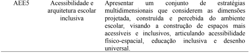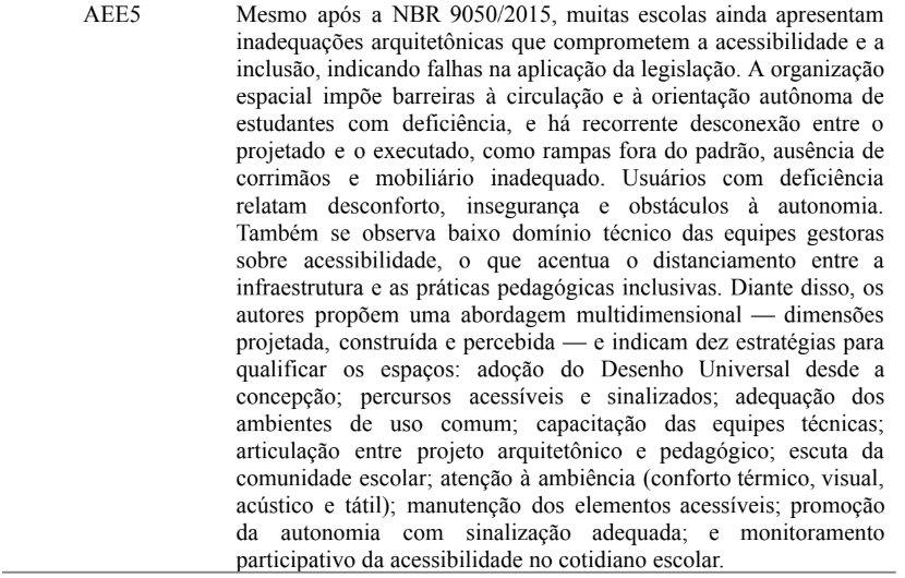 O estudo de Souto Filho e Costa (2021) amplia as discussões dos trabalhos AEE1 (Costa, 2015) e AEE4 (El Tassa et al., 2023). Enquanto os demais estudos enfatizam lacunas formativas, colaboração entre profissionais e a importância do PEI, Souto Filho e Costa propõem uma abordagem multidimensional — projetada, construída e percebida — que revela como falhas arquitetônicas podem comprometer a autonomia dos alunos e dificultar a aplicação de práticas pedagógicas inclusivas, inclusive no AEE. Segundo os autores, essas falhas recorrentes comprometem a efetividade da inclusão, tanto em escolas construídas após a norma, e mesmo em escolas construídas após a vigência da NBR 9050/2015.