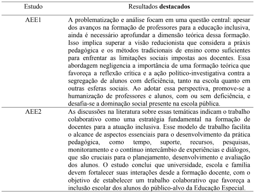 A questão norteadora deste estudo emerge dos desafios identificados na prática da educação inclusiva, sobretudo no que se refere à formação de professores para atuação no Atendimento Educacional Especializado (AEE) no ensino regular. Os estudos analisados demonstram que, apesar dos avanços na formação docente, ainda existem lacunas relacionadas à articulação entre teoria e prática, ao trabalho colaborativo e à individualização do ensino para atender às necessidades dos alunos público-alvo da Educação Especial. A seguir, são apresentados os principais achados de cada estudo, destacando suas contribuições para o debate sobre a qualificação docente na perspectiva da inclusão.