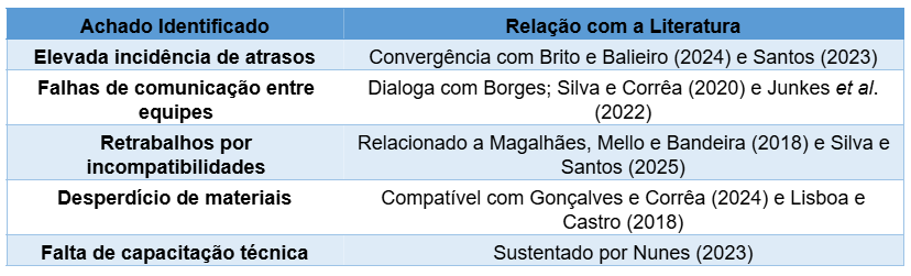 O Quadro 1 trazido logo acima reafirma que os resultados empíricos dialogam intensamente com o referencial teórico deste estudo, reforçando a premissa de que falhas de planejamento constituem o núcleo dos principais problemas enfrentados pelas obras.