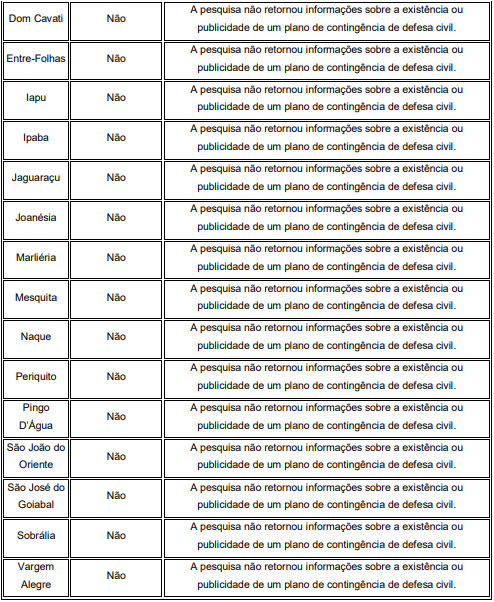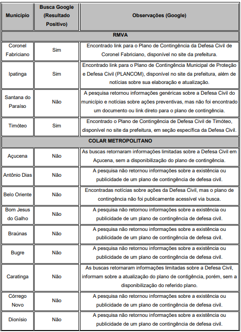 Desta forma, em relação a busca Google, dos 28 (vinte e oito) municípios analisados, apenas 3 (três) municípios (Coronel Fabriciano, Ipatinga e Timóteo) da Região Metropolitana do Vale do Aço apresentaram resultados positivos, disponibilizando seus planos de contingência de defesa civil por meio de seus sites oficiais ou notícias com links diretos.