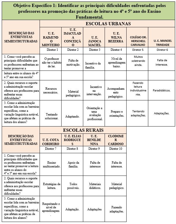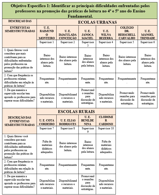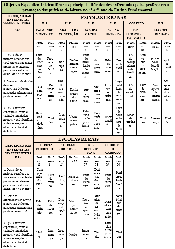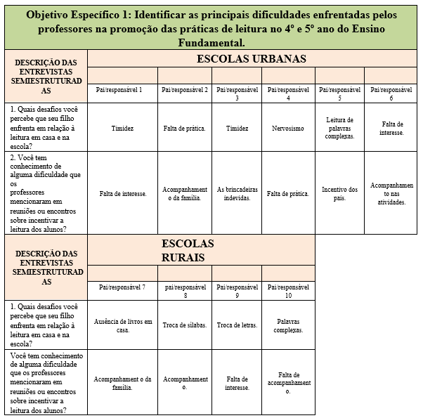 Objetivo Específico 1: Identificar as principais dificuldades enfrentadas pelos professores na promoção das práticas de leitura no 4º e 5º ano do Ensino Fundamental.