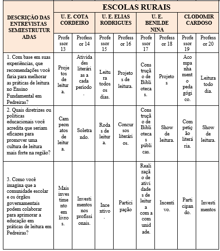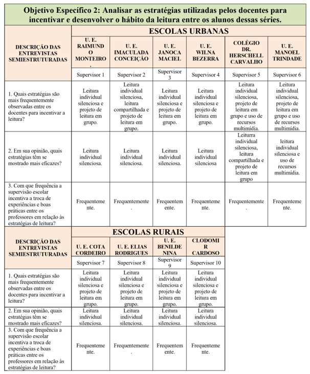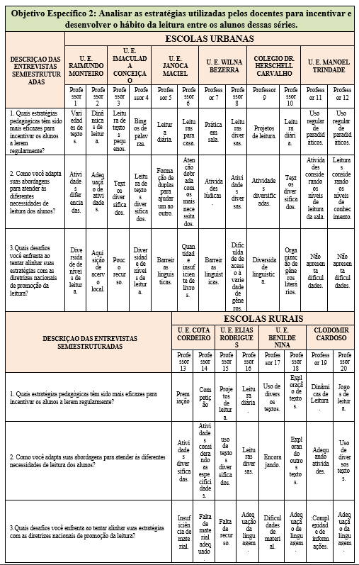 Além das entrevistas, foram realizadas observações em sala de aula, análises documentais, examinando planos de aula, materiais didáticos e projetos de leitura adotados nas escolas, a fim de complementar as informações obtidas nas entrevistas e enriquecer a compreensão das práticas pedagógicas.