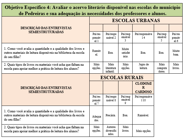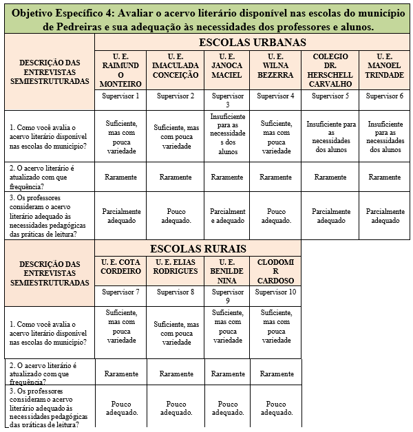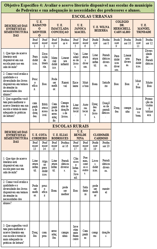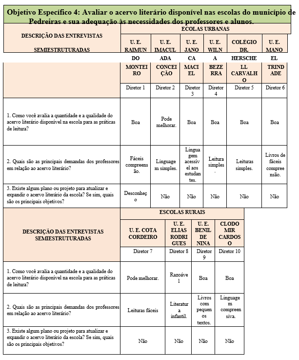 Objetivo Específico 4: Avaliar o acervo literário disponível nas escolas do município de Pedreiras e sua adequação às necessidades dos professores e alunos.