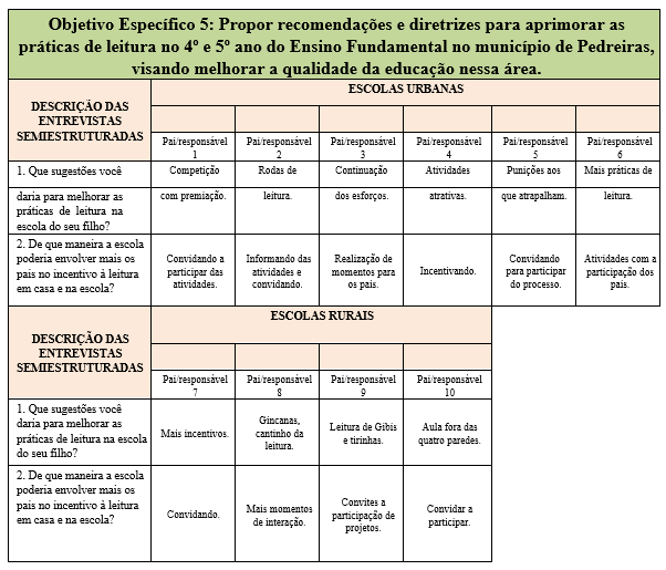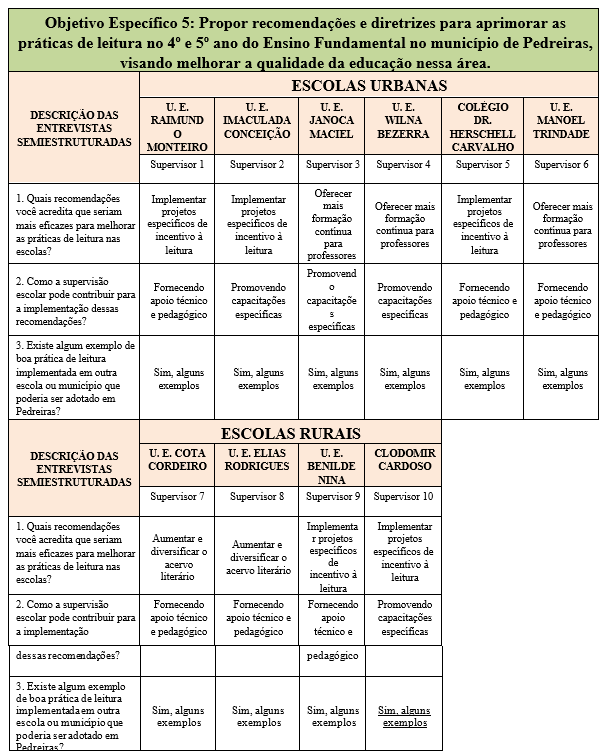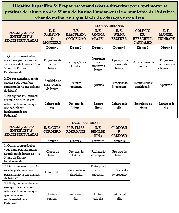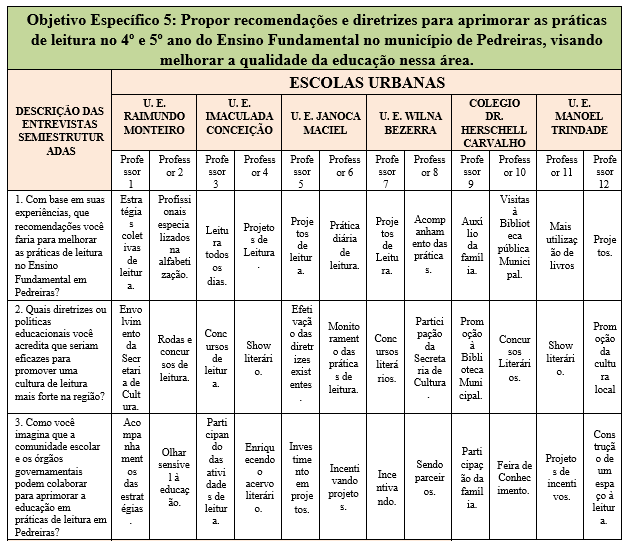 A compreensão detalhada dos sujeitos da pesquisa, seus contextos e experiências contribuiu para uma análise mais precisa dos desafios e possibilidades das práticas de leitura no Ensino Fundamental em Pedreiras, Maranhão. Essas informações serviram como base para a coleta de dados e análise dos resultados da pesquisa, permitindo a formulação de recomendações mais adequadas para aprimorar a qualidade da educação na área de leitura na região.