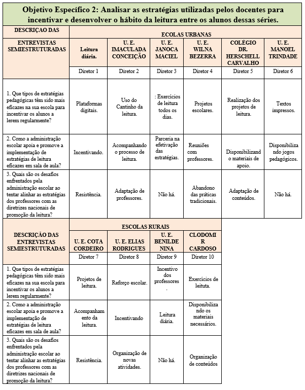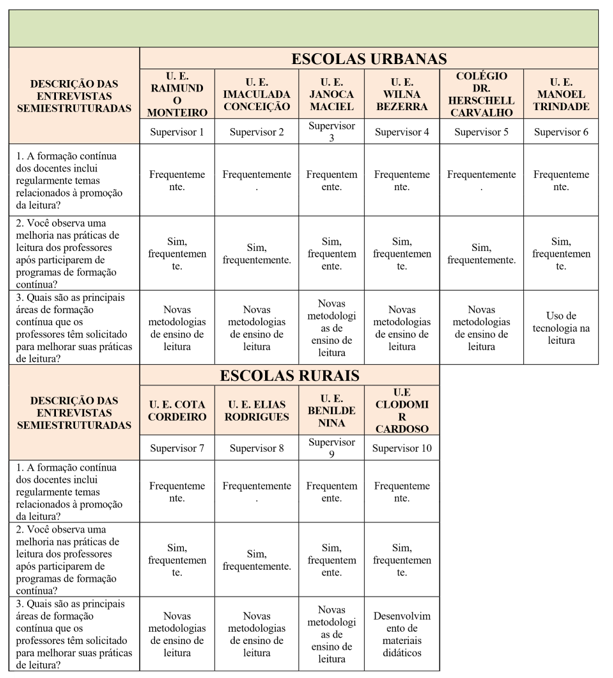 Quanto aos procedimentos metodológicos, a pesquisa utilizou: a) Revisão bibliográfica, com base em estudos sobre práticas de leitura, formação docente e políticas educacionais, a fim de embasar teoricamente a investigação (Severino, 2017); b) Entrevistas semiestruturadas, aplicadas a professores, diretores, supervisores e pais de alunos das escolas urbanas e rurais, buscando compreender suas percepções sobre a formação contínua e suas práticas de ensino da leitura. Segundo Minayo (2014), as entrevistas semiestruturadas permitem coletar informações aprofundadas ao proporcionar um diálogo reflexivo entre pesquisador e entrevistado; Observação direta, realizada nas escolas, com o objetivo de analisar o ambiente escolar, a interação entre professores e alunos e a presença de materiais de incentivo à leitura. De acordo com Lüdke e André (2013), a observação direta é um método essencial para captar nuances do contexto educacional que não são facilmente obtidas por meio de questionários ou entrevistas. E Análise documental: A pesquisa utilizou documentos educacionais, como planos pedagógicos das escolas, diretrizes curriculares e relatórios de desempenho dos alunos, a fim de compreender como as práticas de leitura estão estruturadas institucionalmente. Segundo Cellard (2008), a análise documental é essencial para contextualizar o fenômeno estudado dentro das normas e políticas educacionais vigentes.