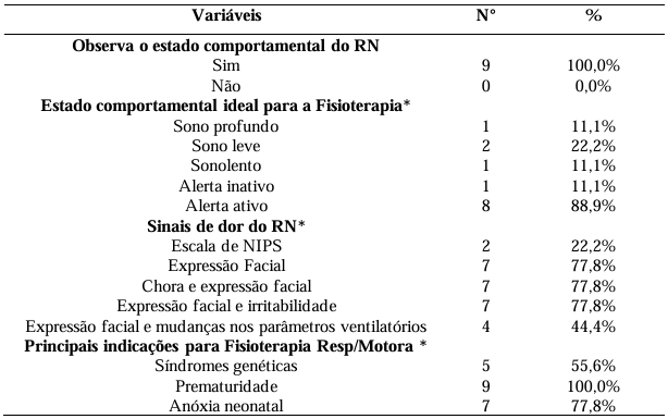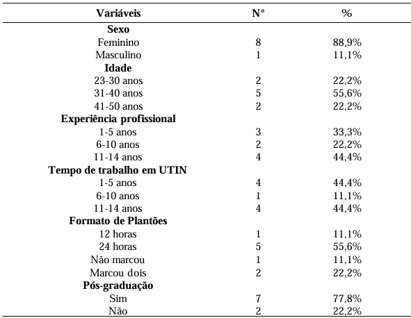 A pesquisa evidenciou que a maioria dos fisioterapeutas é do sexo feminino, com faixa etária entre 31 e 40 anos, com tempo de experiência profissional de 11 a 14 anos na UTIN, formação em nível de pós-graduação e atuação em regime de plantão de 24 horas.