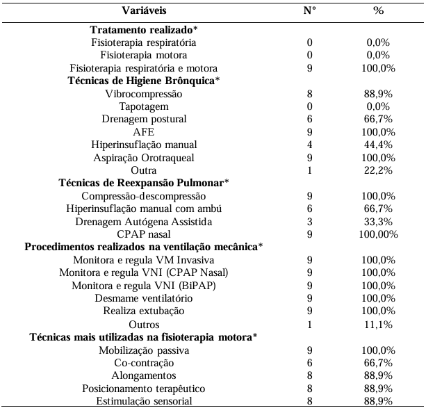 Dentre as patologias mais encontradas, destaca-se a prematuridade e a SDR. Para o tratamento dessas condições, foram relatadas intervenções motoras e respiratórias, como AFE, aspiração, compressão-descompressão, estímulo sensório-motor, além da utilização de recursos de ventilação não invasiva, como CPAP e o BiPAP.