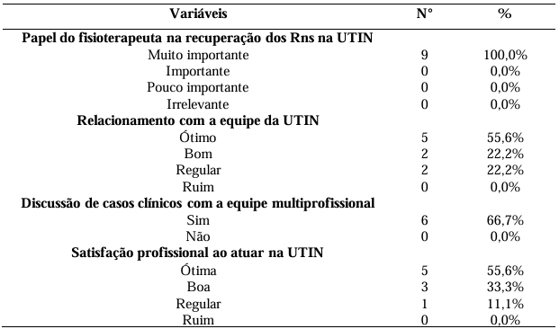 Tabela 5 – Percepções e satisfação dos fisioterapeutas na atuação em UTI Neonatal (UTIN) (n=9)