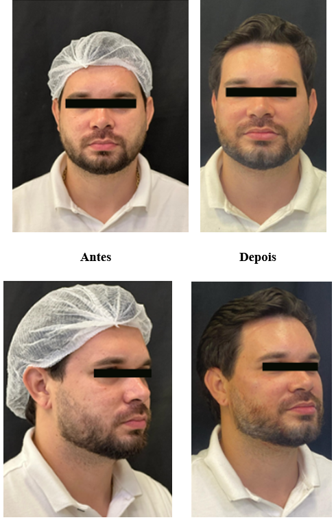 O paciente apresentou como principal queixa a ausência de definição na região mandibular e no mento, o que, segundo ele, conferia ao seu rosto um aspecto “infantil” e menos expressivo. Antes da execução do procedimento, foi realizada uma anamnese completa, com coleta de informações sobre sexo, idade, estado geral de saúde e motivação pessoal para a realização do tratamento, a fim de alinhar as expectativas e prevenir possíveis frustrações quanto aos resultados esperados.