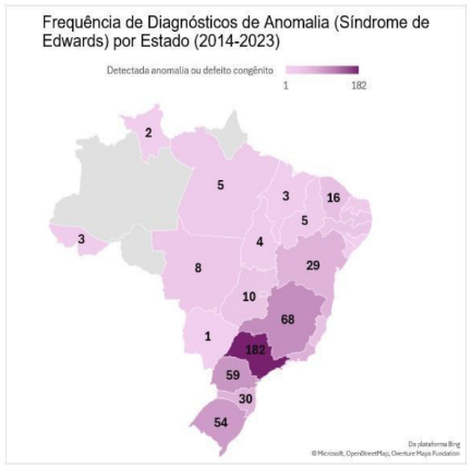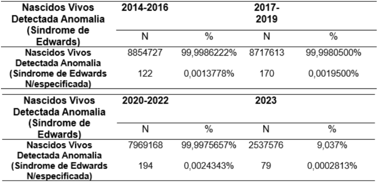 Entre os anos de 2014 e 2023 foram registrados 565 diagnósticos de nascidos vivos detectado anomalia Síndrome de Edwards, foram observados 34 (0,0001211%) em 2014, 35 (0,0001246%) em 2015, 53 (0,0001888%) em 2016, 57 (0,0002030%) em 2017 e 2018, 56 (0,0001994%), em 2019, 61 (0,0002172%) em 2020, 59 (0,0002101%) em 2021, 74 (0,0002635%) em 2022 e 79 (0,0002813%) em 2023.