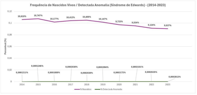 Ao analisar a frequência de nascidos vivos comparado a nascidos vivos com a Síndrome de Edwards é notável a discrepância de valores, seguindo a descrição de que a Síndrome de Edwards é uma anomalia rara e que em 95% dos seus casos resultam em aborto espontâneo o que resulta em uma porcentagem mínima dos 5% dos nascidos vivos.