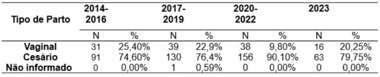 O DATASUS traz que durante o período de 2014 a 2016 ocorreram o total 91 (74,60%) de cesárias, 31 (25,40%) foram vaginais, enquanto nos anos de 2017 a 2019 a quantidade de cesárias aumentou, obtendo um valor de 130 (76,4%) partos embora o número de parto vaginal também tenha aumentado chegando ao número de 39 (22,9%) partos. Nos anos de 2020 a 2022 a discrepância é ainda mais visível onde o número de cesárias chegou a 156 (90,10%), e vaginal com o valor de 38 (9,80%) partos com um percentual mínimo, no ano de 2023 a porcentagem de cesárias contínuo se sobrepondo com 63 (79,75%) e vaginal com 16 (20,25%).