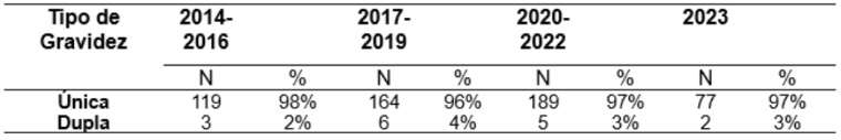 As gravidezes duplas apresentam uma proporção menor, observando 2% entre 2014 e 2016, 4% nos anos de 2017 a 2019, 3% entre 2020 e 2022, se repetindo no ano de 2023, apresentando um pequeno aumento nos anos de (2017-2019), obtendo um declínio nos anos seguintes.