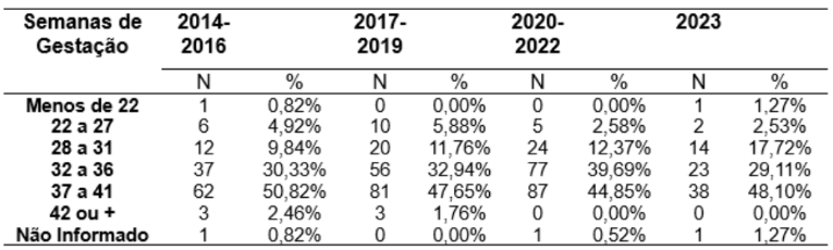 Na tabela é possível observar que esses estudos se comprovam, em que mostram que um grande percentual das gestações obtiveram de 37 a 41 semanas de duração, chegando a 50,83% entre os anos de 2014 a 2016 se mantendo em um percentual relativamente parecido nos anos seguintes, com 47,65% entre 2017 e 2019, 44,85% nos anos de 2020 a 2022, 48,10% no ano de 2023.