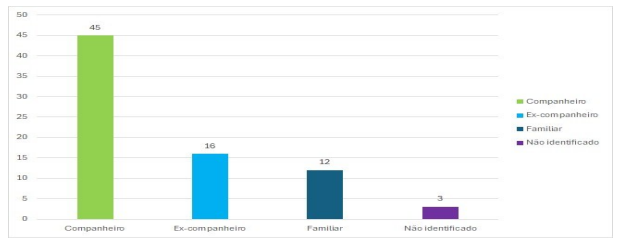 Em relação ao tipo de vínculo entre a vítima e o agressor, mais da metade dos casos de tipo de violência são cometidos pelos companheiros das vítimas, 59.21% das ocorrências. Em seguida, foram encontrados 16 casos em que o agressor era ex companheiro que ainda mantinha vínculo com a ex-parceira, em sua maioria por vínculo de coparentalidade, 12 casos em que o agressor era algum membro da família, como pai, irmão, tio etc. e em 3 casos dos 76 encontrados não foram descritos na noticia o vínculo que vítima e agressor mantinham.