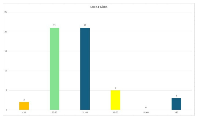 A faixa etária de maior prevalência dos agressores foi maior entre os 20 e 30 anos , representando 21 casos e dos 31 a 40 anos com também encontrados em 21 das violências.Com apenas 2 casos em idades inferiores a 20 anos e 3 casos em que o agressor apresentava mais de 60 anos.