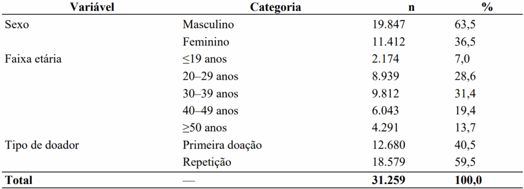 Essa predominância masculina é amplamente descrita em estudos realizados no Brasil e em outros países de baixa endemicidade, e pode estar associada à maior participação dos homens nas campanhas de doação, bem como a comportamentos de risco historicamente mais frequentes nesse grupo, como múltiplas parcerias sexuais e menor adesão a medidas preventivas (AGUIAR et al., 2007; PEREIRA et al., 2022).