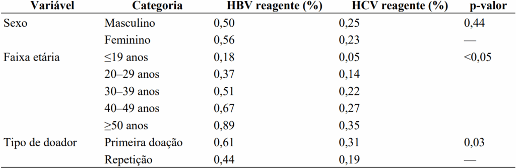 Estudos realizados na Região Norte reforçam esse padrão: Oliveira et al. (2023) identificaram predomínio de casos reagentes de HBV e HCV em doadores acima de 40 anos, com prevalência crescente nas faixas etárias mais altas. Quanto ao tipo de doador, de acordo com os dados apresentados na Tabela 6,  a prevalência significativamente maior entre os doadores de primeira vez (HBV = 0,61%; HCV = 0,31%) em comparação aos doadores de repetição (HBV = 0,44%; HCV = 0,19%) corrobora achados de outros hemocentros nacionais (SILVA et al., 2022).