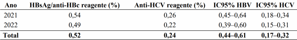 Comparado a esse valor (aprox. 0,97% para HCV e ~0,18–0,68% para HBsAg/antiHBc), os nossos 0,24% para HCV e 0,52% para HBV situam-se em faixa inferior ou compatível com baixa endemicidade, considerando que utilizamos o critério HBsAg/anti-HBc agrupado para HBV. Além disso, estudo recente de tendência nacional identificou prevalência de HBV de ~1,28% no ano de 2020, e de HCV de ~0,26% entre doadores em um hemocentro do Rio de Janeiro entre 2014–2021 (CUNHA et al., 2025).