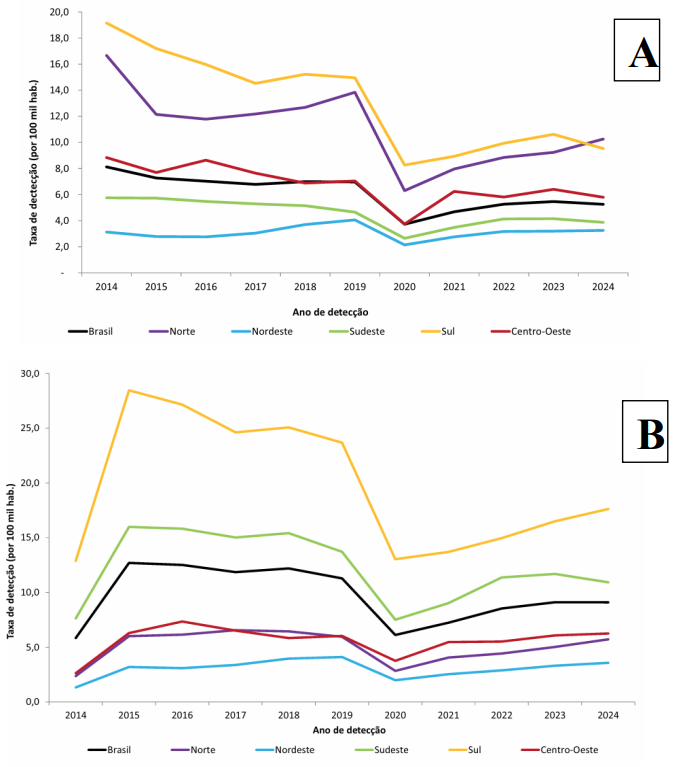 Figura 5 – Taxa de detecção de hepatite B (A) e C (B) (por 100.000 habitantes) segundo região de residência e ano de detecção. Brasil, 2014 a 2024.