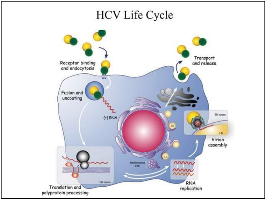 Legenda: Ciclo de Vida do Vírus da Hepatite C (HCV): O processo ilustrado detalha as etapas essenciais para a replicação do HCV na célula hospedeira. O vírus inicia ligando-se a receptores específicos e entrando na célula por endocitose. Segue-se a fusão da membrana e desnudamento, liberando o RNA viral de fita positiva (que serve como molde para a fita negativa – RNA (-)). O RNA viral é então traduzido em uma poliproteína, que é processada em proteínas funcionais no retículo endoplasmático (ER lumen). A replicação do RNA ocorre em membranas especializadas (“membranous web”). Posteriormente, ocorre a montagem do vírion (Virion assembly) no lúmen do ER, e os novos vírions são então transportados e liberados da célula para infectar novos hepatócitos.