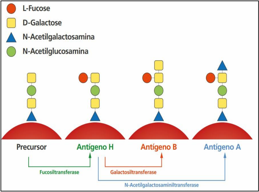 Figura 2. Biossíntese dos antígenos do sistema ABO de grupos sanguíneos.