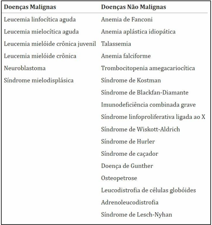 TABELA 1 – Doenças tratadas por transplante de sangue do cordão umbilical