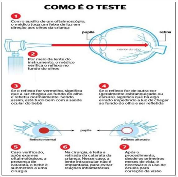 O exame é melhor realizado nas primeiras horas de vida ou antes que o bebê saia do hospital. Depois disso, é fundamental que o médico seja constantemente acompanhado no âmbito das consultas de rotina, que devem ser realizadas durante o primeiro ano de vida. Na Figura 2 se nota como é realizado o teste do olhinho. (CHOUGULE et al., 2018).