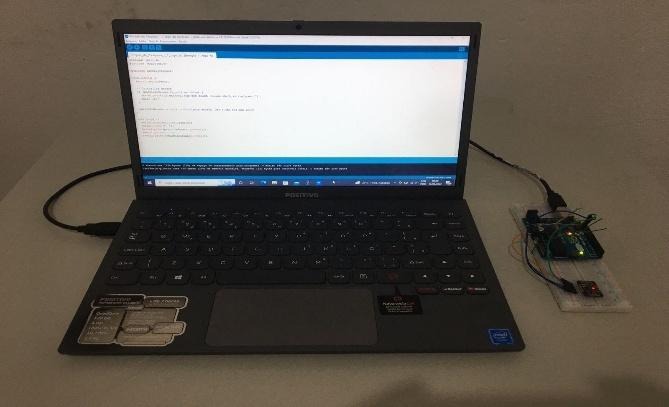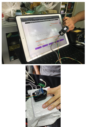 Nessa etapa inicial, a parte eletrônica ainda se encontrava exposta; porém, já era possível realizar as medidas dos sinais vitais de uma pessoa em um ambiente sem radiação ionizante. Foram simulados testes em laboratório, com o operador do instrumento, de forma a aferir o funcionamento dos sensores, para obtenção de dados em tempo real na plataforma Arduino.