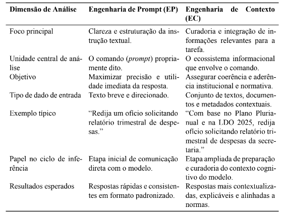 Entre as metodologias mais promissoras destacam-se a Engenharia de Prompt (EP) e a Engenharia de Contexto (EC). A primeira baseia-se na formulação de instruções diretas, claras e bem estruturadas para orientar o comportamento do modelo. A segunda representa uma evolução dessa lógica, ao ampliar o escopo para incluir elementos adicionais de contexto — como histórico institucional, metas, restrições normativas e perfis de usuários — durante a inferência. Conforme Anthropic (2025) e Liu et al. (2023), a Engenharia de Prompt (EP) foca na clareza das instruções, enquanto a Engenharia de Contexto (EC) fundamenta-se na curadoria das informações relevantes que condicionam a resposta.