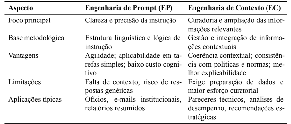 Parte-se da hipótese de que a Engenharia de Contexto tende a gerar respostas mais consistentes, contextualizadas e aplicáveis em cenários complexos, como a elaboração de relatórios de desempenho, notas técnicas e comunicações oficiais. A Engenharia de Prompt, por sua vez, mostra-se mais eficiente em demandas diretas e rotineiras, como instruções simples, redação padronizada e respostas rápidas.