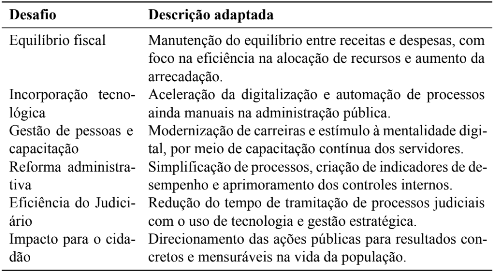 Conforme a Falconi et al. (2023), os principais desafios enfrentados pela administração pública envolvem o equilíbrio fiscal, a incorporação tecnológica, a gestão de pessoas, a reforma administrativa, a eficiência do Judiciário e o impacto direto das ações públicas na vida do cidadão. A IA generativa tem potencial para mitigar esses desafios, oferecendo automação de diagnósticos, predição de gargalos e suporte à comunicação interinstitucional.